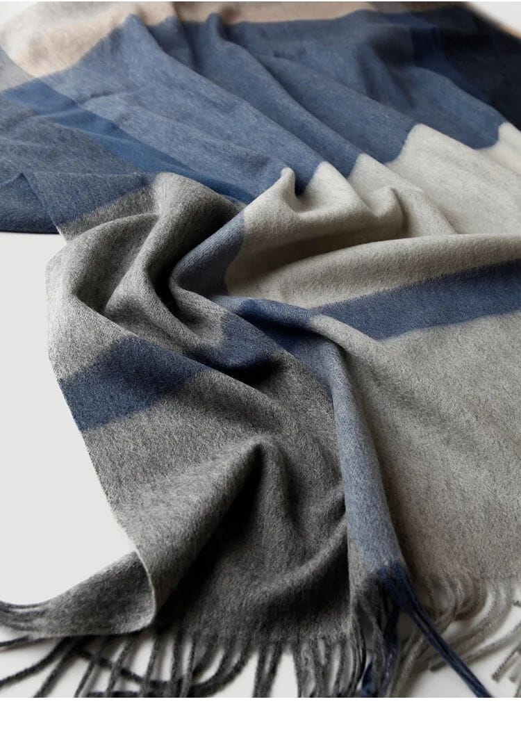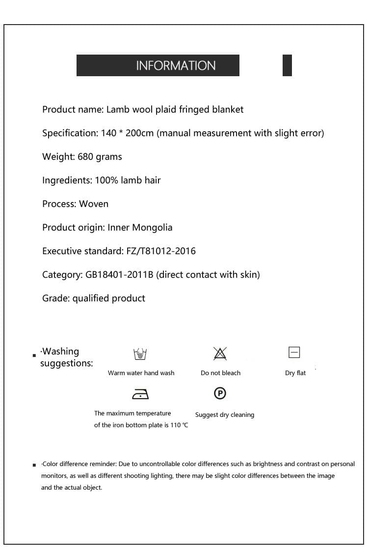 Upplev den lyxiga känslan av en äkta lammullsfilt, tillverkad av högkvalitativ ull från Inre Mongoliet. Med en vacker rutdesign och eleganta fransar, kombinerar denna filt stil, komfort och funktionalitet – perfekt för både hemmet och resor.