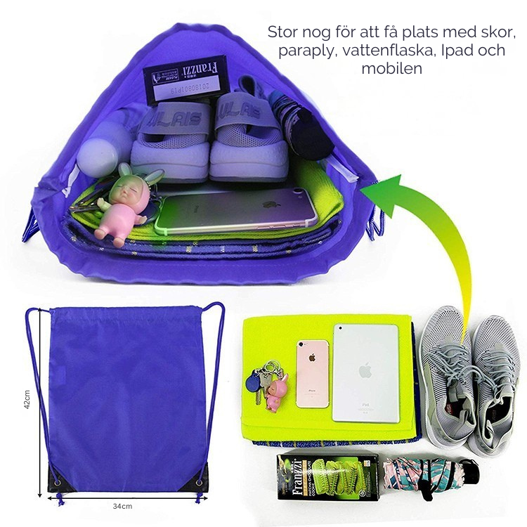 Snörstängningen gör den enkel att öppna och stänga, samtidigt som den fungerar som bärremmar så att du smidigt kan bära den på ryggen eller över axeln. Den slitstarka designen i polyester gör att påsen håller för daglig användning, oavsett om det är för gymmet, skolan eller fritidsaktiviteter. Välj mellan flera färgalternativ för att hitta din favorit.